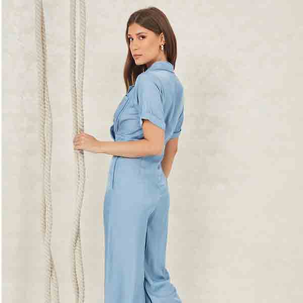 Blue solid basic jumpsuit, has a shirt collar, short sleeves, pockets