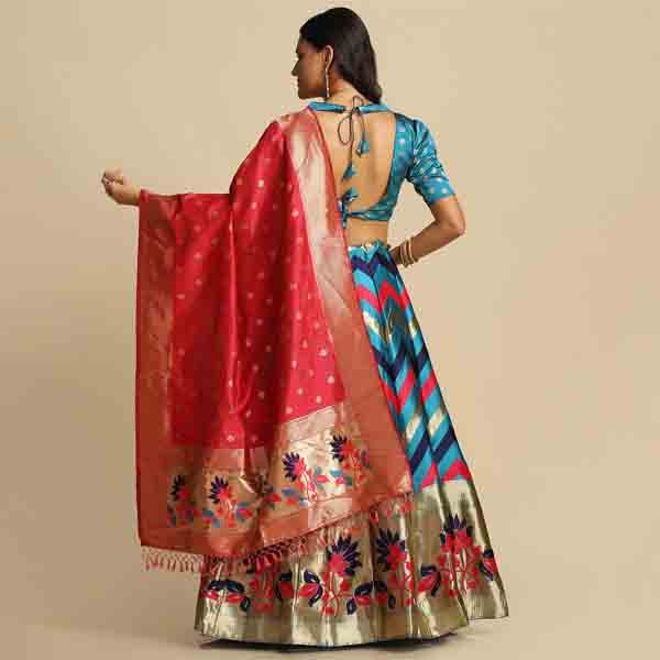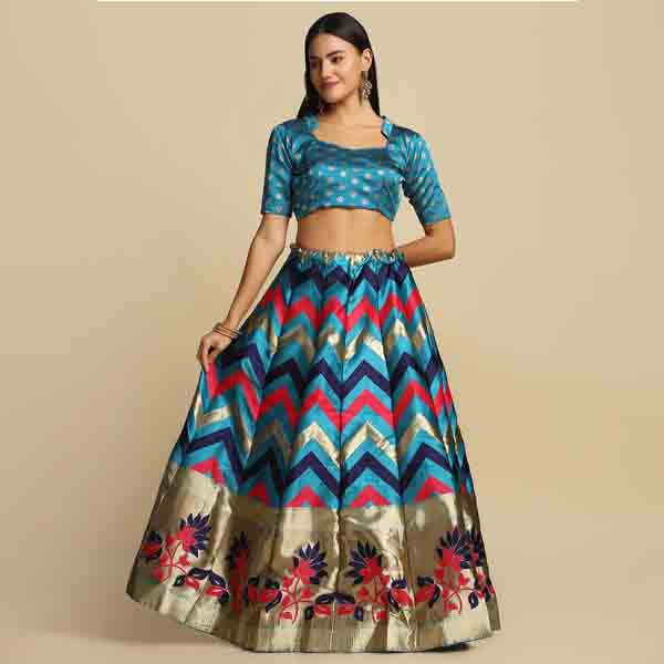 lehenga fabric: silk || inner fabric: crepe || choli fabric: jacquard silk || dupatta fabric: jacquard silk || lehenga length: 42 inch || choli size: 0.8 mtr || dupatta width: 38 inches/ 0.95 meter , dupatta length : 2.15 meter/ 84.64 inches|| lehenga work: gold woven work || choli work: woven work || dupatta work: gold woven work