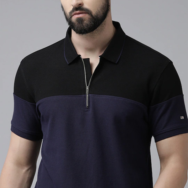 Men Navy Blue Striped Polo Collar Pure Cotton T-shirt