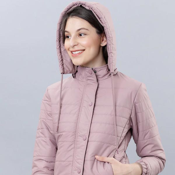 Pink solid jacket, has a hooded, 2 pockets, button closure, three-quarter sleeves, straight hem, and unlined lining